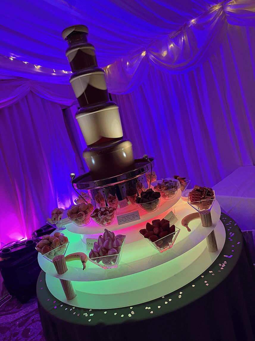 Every Dribblys Chocolate Fountain is supplied with our unique custom LED surround and up-lit chocolate. Our custom made LED surround can be set to include our fabulous Rainbow effect, colour rotate, stationary colour or double colour modes. We also supply additional LED backlights. Making our Chocolate Fountains an incredible show stopping addition to your event and a great place for your guests to come and hang out.